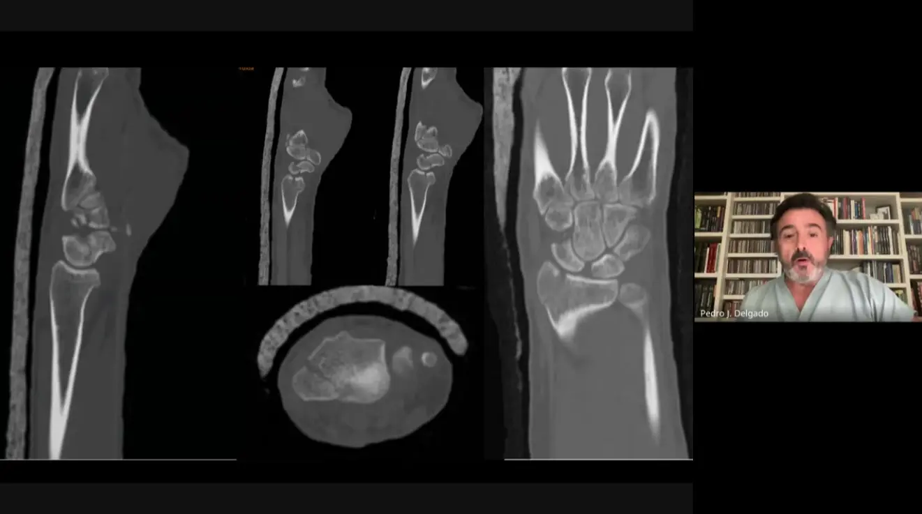 Abordaje de Fracturas Intraarticulares Complejas: Se presentó un caso de un paciente joven con una fractura intraarticular compleja de radio distal y afectación del escafoides. Pedro J. Delgado la consideró quirúrgica, especialmente por la afectación del escafoides y la inestabilidad de la fractura, que involucra gran parte de la articulación radial y se asocia a lesiones ligamentosas. Su secuencia preferida incluye primero una artroscopia para visualización, limpieza del hematoma, y prueba de reducción, para luego proceder con el abordaje palmar.